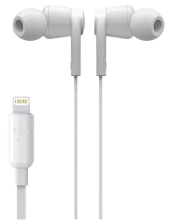 TAKE A JOURNEY INTO SOUNDWith high quality sound, supreme comfort and fit, and exceptional durability, ROCKSTAR Headphones with Lightning Connector are the headphones you, and your iPhone, have been waiting for. Packed with features, including water-resistance and noise-isolation, these compact headphones deliver superior audio without distraction so you can lose yourself in music, be transported to a different world with an audio book, or experience the highs and lows of every story with compelling podcast content.THE BELKIN DIFFERENCEPioneer in innovation and technology for over 35 yearsInnovative design provides a perfect fit to your ear for superior sound and noise isolationComprehensive testing procedures guarantee quality and durabilityMFi-approved for added peace of mind A PERFECT FIT FOR A PERFECT SOUNDPerfectly-fitting headphones create a far superior sound. ROCKSTAR combines ear tips that can be tailored to your ear, with a design that actively directs the sound towards your eardrum. The result is excellent noise isolation, so you can be sure you are experiencing the music as the artist intended. Every drumbeat, every lyric, every instrument and every breath in the original recording is clearly replicated for your ear. With playback this flawless, the only thing that might get lost is you.COMFORT IS MUSIC TO YOUR EARSPoorly-fitting earbuds are a main contributor to headphone discomfort. With three differently-sized ear tips provided with ROCKSTAR, it’s easy to find the right fit for a more comfortable listening experience. Holding the ear tips, angled drivers reduce strain on your ear, so you can enjoy all-day comfort, and listen to the music you love, for as long as you like.SWEAT AND SPLASH-RESISTANTWherever you listen to music, your ROCKSTAR headphones are designed to go with you. This is why we made them sweat and splash-resistant making them ideal for all-weather use, as well as fitness or gym sessions. LONG LASTING DURABILITYOver 35 years’ experience in designing cables has taught us a few things. ROCKSTAR headphones are highly flexible and reinforced at major stress points, to withstand heavy use in multiple environments. Comprehensive testing procedures, covering everything from sustained usage to extreme environmental conditions, guarantee durability.TANGLE-FREEThe flat, lightweight design keeps the headphone cable tangle-free in a pocket or bag. When in use, the cable management feature keeps excess cable out of your way, and positions the microphone for easy, hands-free calling. PUTTING YOU IN CONTROLYour ROCKSTAR headphones are ready to use straight out of the box no adapter or prior charging required. The multi-control button makes it easy to play, pause, skip tracks, change volume or answer a phone call at the touch of a button. The clear, built-in microphone makes it easy to take calls without removing the headphones.A WARRANTY YOU CAN TRUSTWe are dedicated to quality and provide a 2-Year Limited Warranty with your ROCKSTAR Headphones with Lightning Connector. This product is engineered and tested to ensure flawless performance even with heavy use.
